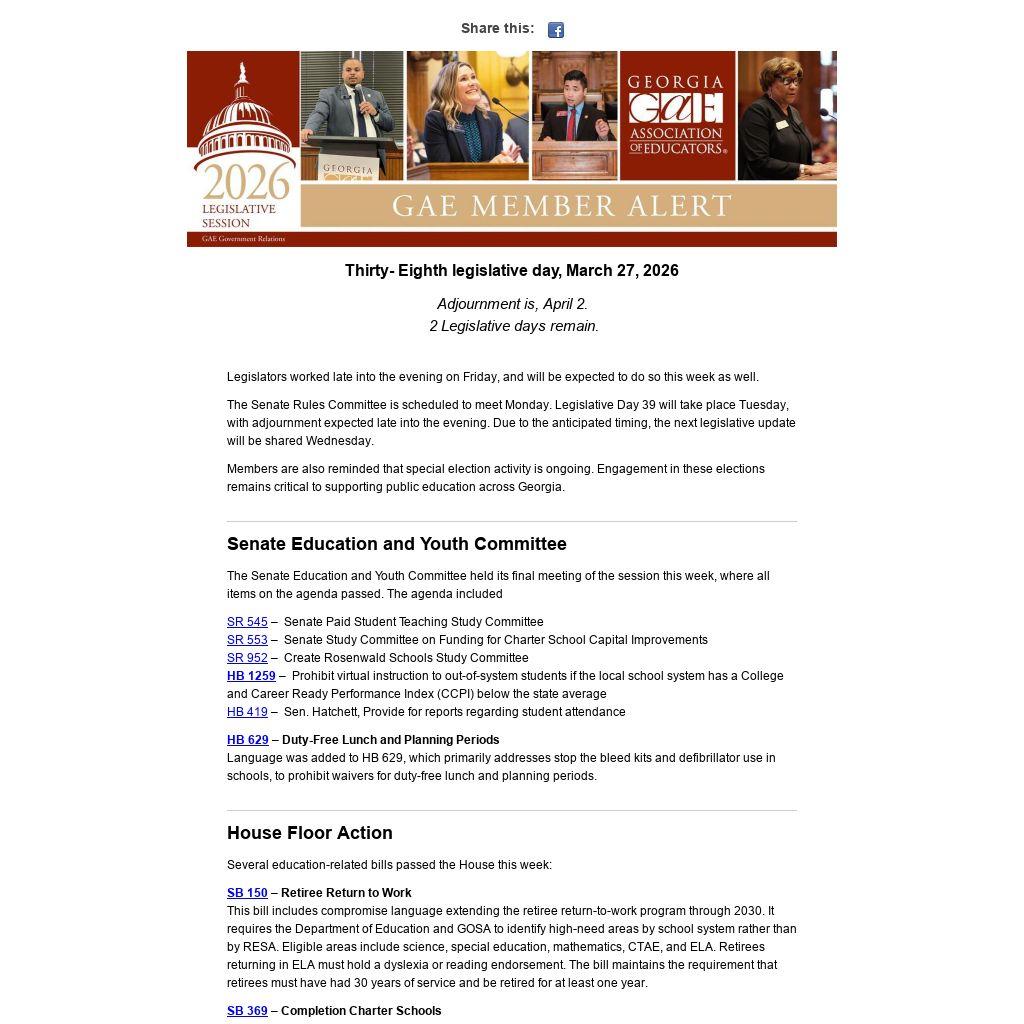 GAE will continue to monitor developments closely and keep members informed. These final days of session are critical, and we encourage members to remain engaged and prepared to take action on issues impacting Georgia’s public schools.