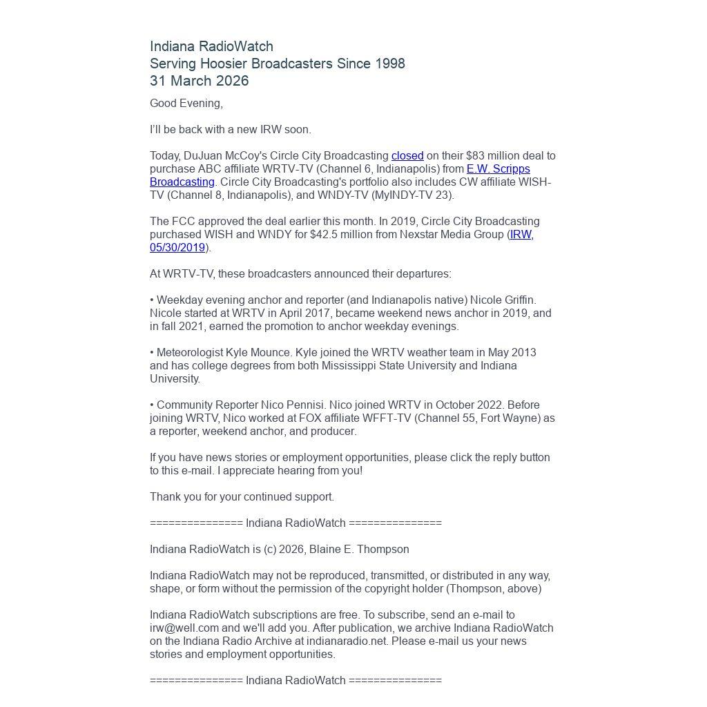 Indiana RadioWatch subscriptions are free. To subscribe, send an e-mail to irw@well.com and we'll add you. After publication, we archive Indiana RadioWatch on the Indiana Radio Archive at indianaradio.net. Please e-mail us your news stories and employment opportunities.