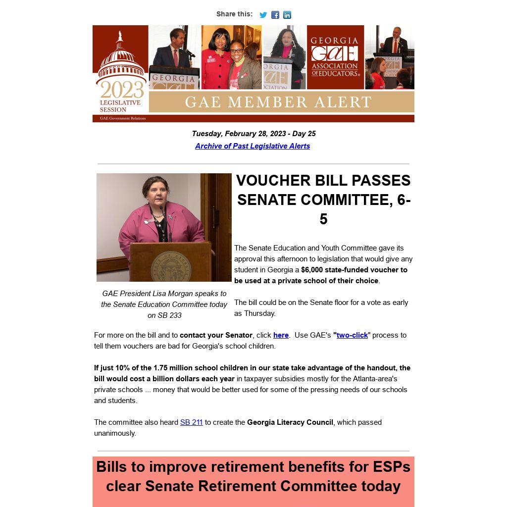 HB 538, the Georgia Early Literacy Act, was also heard. The sponsor of the bill is Houston County Republican Bethany Ballard. HB 538 unanimously passed committee by a substitute. GAE's member and president of the Cobb County Association of Educators (CCAE) was present to testify for the bill. The committee also heard HB 537, another literacy bill, which states: Beginning July 1, 2025, "at least 20 percent of annual training requirements for all new and existing child care learning centers and family child care learning home providers shall be focused on age-appropriate evidence based literacy instruction." HB 537 also passed out of committee.