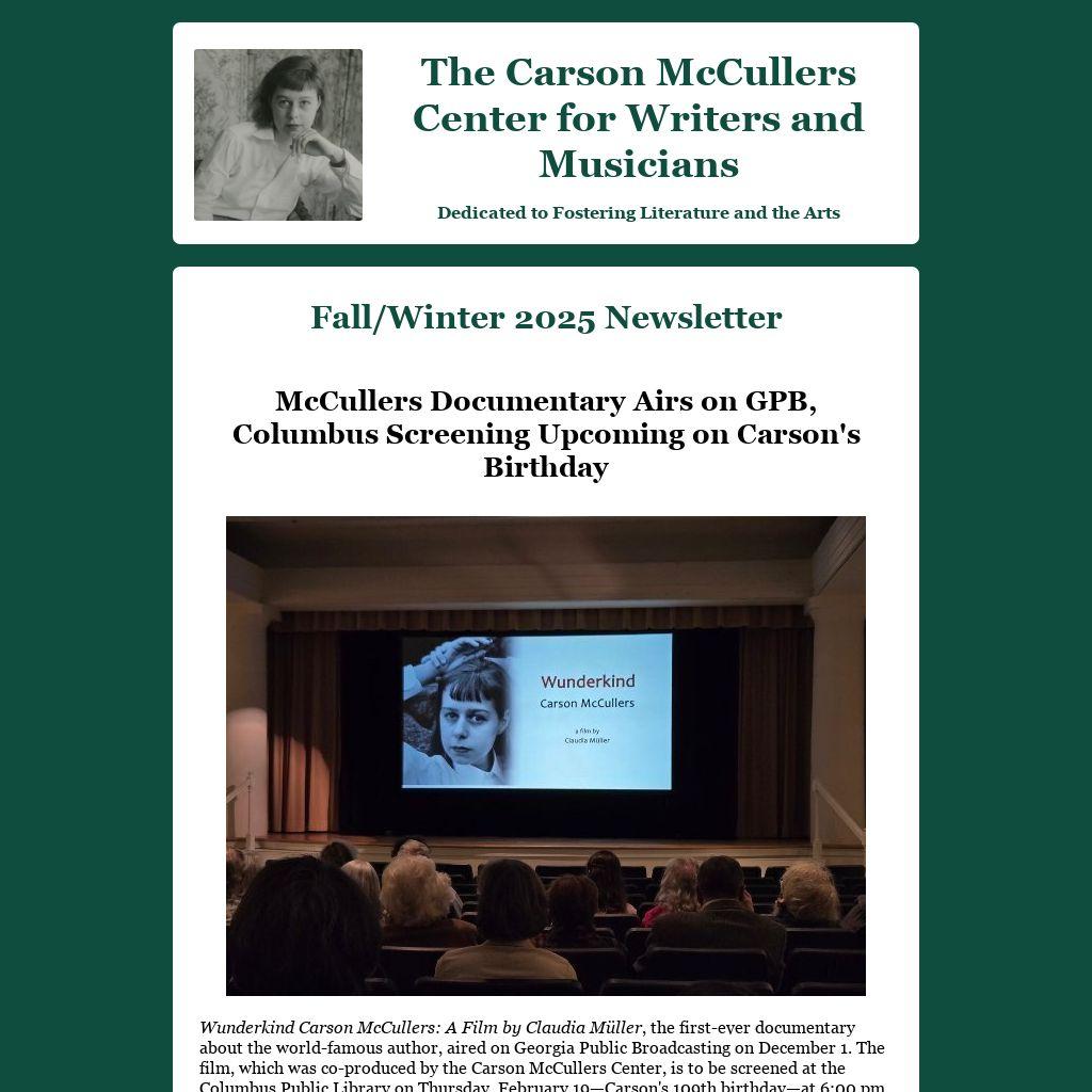 Wunderkind Carson McCullers: A Film by Claudia Müller, the first-ever documentary about the world-famous author, aired on Georgia Public Broadcasting on December 1. The film, which was co-produced by the Carson McCullers Center, is to be screened at the Columbus Public Library on Thursday, February 19—Carson's 109th birthday—at 6:00 pm. The screening will feature a pre-recorded introduction from acclaimed director Claudia Müller and will be followed by a staged conversation between GPB broadcaster Orlando Montoya and McCullers Center Director Nick Norwood.