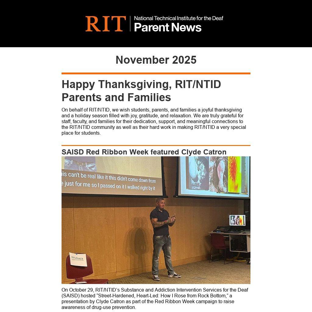 On behalf of RIT/NTID, we wish students, parents, and families a joyful thanksgiving and a holiday season filled with joy, gratitude, and relaxation. We are truly grateful for staff, faculty, and families for their dedication, support, and meaningful connections to the RIT/NTID community as well as their hard work in making RIT/NTID a very special place for students.