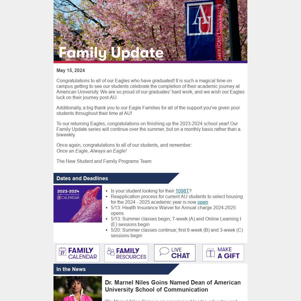 Additionally, a big thank you to our Eagle Families for all of the support you've given your students throughout their time at AU!