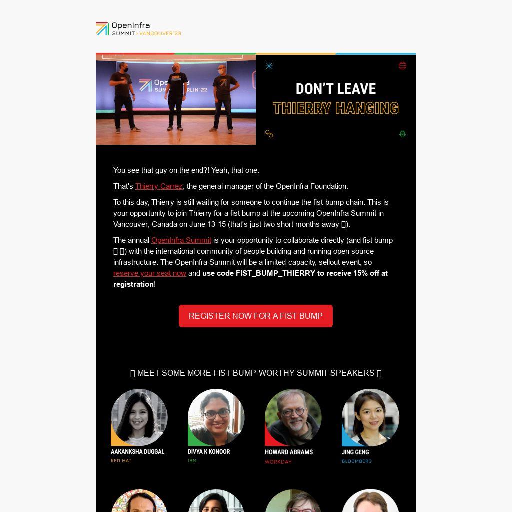 To this day, Thierry is still waiting for someone to continue the fist-bump chain. This is your opportunity to join Thierry for a fist bump at the upcoming OpenInfra Summit in Vancouver, Canada on June 13-15 (that's just two short months away 😬).