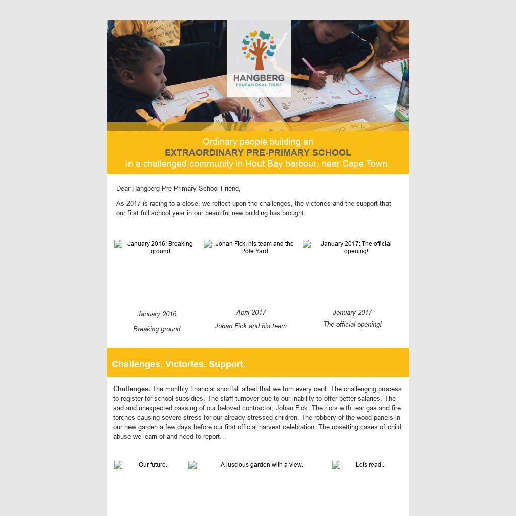 Hangberg Pre-Primary School NPC (funded by HET) has four classes with more than 100 children aged four to six years. The school employs 14 staff members from the local community. The monthly fee of only R500 pm includes quality teaching and care from 7:30 until 14:30 as well as two cooked meals (Friday school closes at 12:00). Aftercare until 18:00 is available at an additional R100 pm. The fee pay-rate is good but there are still some who really cannot afford fees. The government subsidies registration process is tedious and we do not expect to receive any before calendar year 2019.