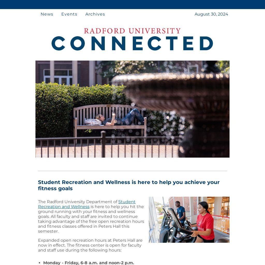 The Radford University Department of Student Recreation and Wellness is here to help you hit the ground running with your fitness and wellness goals. All faculty and staff are invited to continue taking advantage of the free open recreation hours and fitness classes offered in Peters Hall this semester.