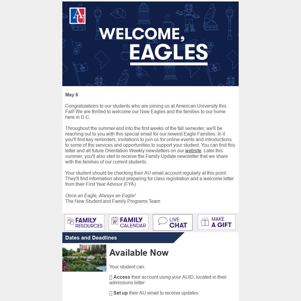 Throughout the summer and into the first weeks of the fall semester, we'll be reaching out to you with this special email for our newest Eagle Families. In it you'll find key reminders, invitations to join us for online events and introductions to some of the services and opportunities to support your student. You can find this letter and all future Orientation Weekly newsletters on our website. Later this summer, you'll also start to receive the Family Update newsletter that we share with the families of our current students.Â