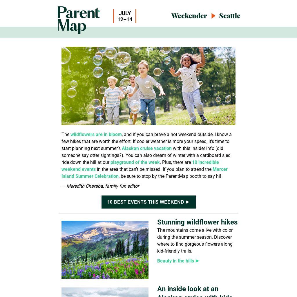 The wildflowers are in bloom, and if you can brave a hot weekend outside, I know a few hikes that are worth the effort. If cooler weather is more your speed, it’s time to start planning next summer’s Alaskan cruise vacation with this insider info (did someone say otter sightings?). You can also dream of winter with a cardboard sled ride down the hill at our playground of the week. Plus, there are 10 incredible weekend events in the area that can’t be missed. If you plan to attend the Mercer Island Summer Celebration, be sure to stop by the ParentMap booth to say hi!