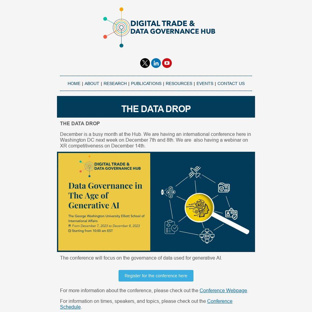 On November 2, Susan Aaronson, Hub Director spoke at the University of Ottawa on Digital Trade and Generative AI and on November 3 on generative AI at the Canadian Association for Security and International Studies. On November 8, Aaronson spoke on XR Competitiveness for an XR Association event on the Hill. On November 28, Aaronson organized a panel for WTO staffers on digital trade. On November 29, Aaronson spoke at the Council on Foreign Relations on digital trade. On November 30, Aaronson moderated a panel on global AI governance at the Athens Roundtable in Washington DC.