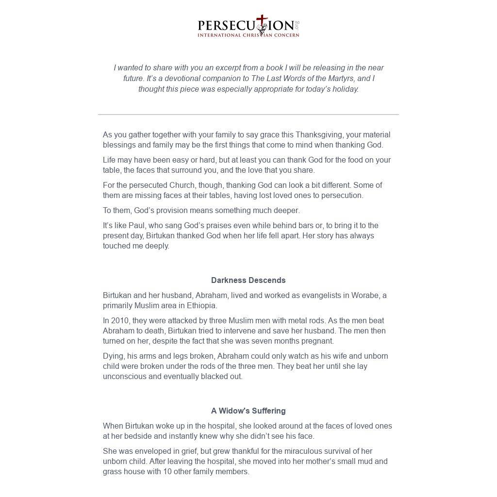 Birtukan thanked God for the survival of her baby and, in faith, named her “Light” even after the unjust murder of her husband. In thanking God, she acknowledged that His plan was better than her own.