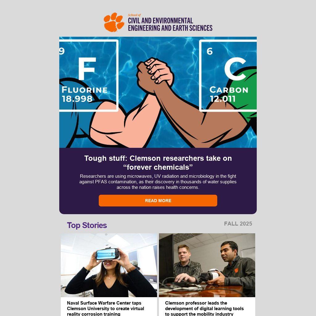 The School of Civil and Environmental Engineering & Earth Sciences Newsletter is published by the School in Clemson University’s College of Engineering, Computing and Applied Sciences.
