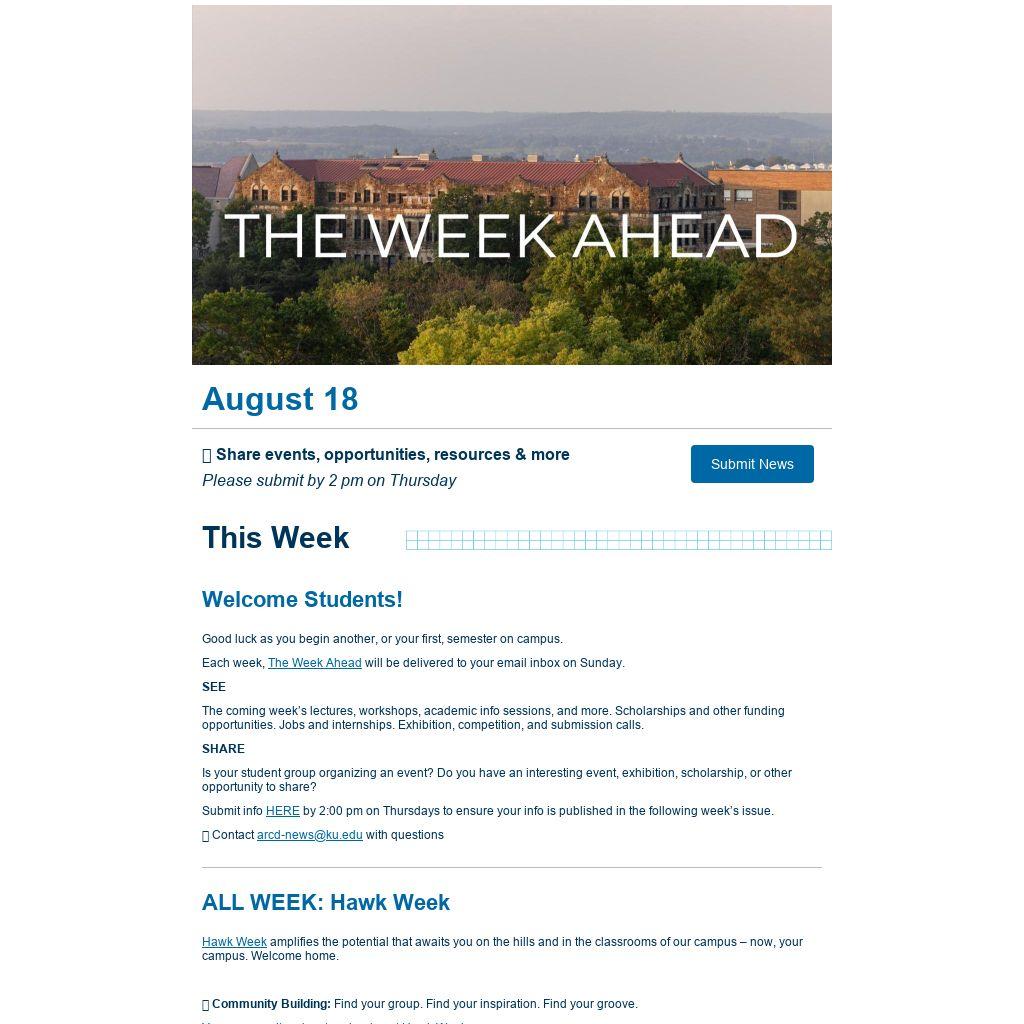Each week, The Week Ahead will be delivered to your email inbox on Sunday.