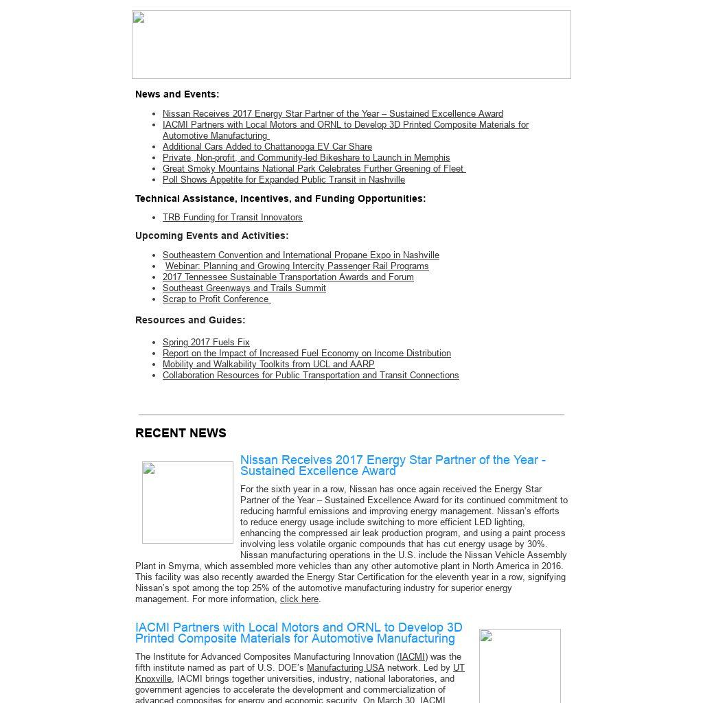 The Tennessee Department of Environment and Conservation (TDEC), in partnership with the Tennessee Department of Transportation and Tennessee Clean Fuels, will hold the third annual Tennessee Sustainable Transportation Awards and Forum during Clean Air Month from May 23-24 at the Nashville Public Library. The forum, entitled “Navigating Toward a Livable Tennessee,” will highlight local transportation planning and the pursuit of place-based policies and investments for improved transportation options in our communities. The keynote will be delivered by Russ Brooks, Smart Cities Director at Transportation for America, an organization focused on supporting the development of smart, sustainable, and locally driven transportation policies across the U.S. The morning address on May 24 will be delivered by Metropolitan Government of Nashville and Davidson County Mayor Megan Barry. An awards luncheon will be held on the second day of the forum, and will include remarks from Tennessee Department of Environment and Conservation Commissioner Bob Martineau and Tennessee Department of Transportation Deputy Commissioner Toks Omishakin. The awards recognize outstanding initiatives to improve the efficiency, accessibility, affordability, and sustainability of transportation systems in the State, consistent with ongoing efforts to improve the health and well-being of Tennesseans, provide for a strong economy, and protect our State’s natural resources. 2017 forum panel topics will include: - Behavior Change - Transportation demand management and the utilization of alternatives to single occupancy vehicles