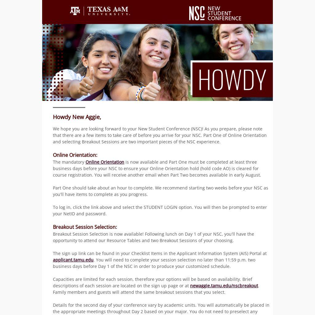 The sign up link can be found in your Checklist Items in the Applicant Information System (AIS) Portal at applicant.tamu.edu. You will need to complete your session selection no later than 11:59 p.m. two business days before Day 1 of the NSC in order to produce your customized schedule.