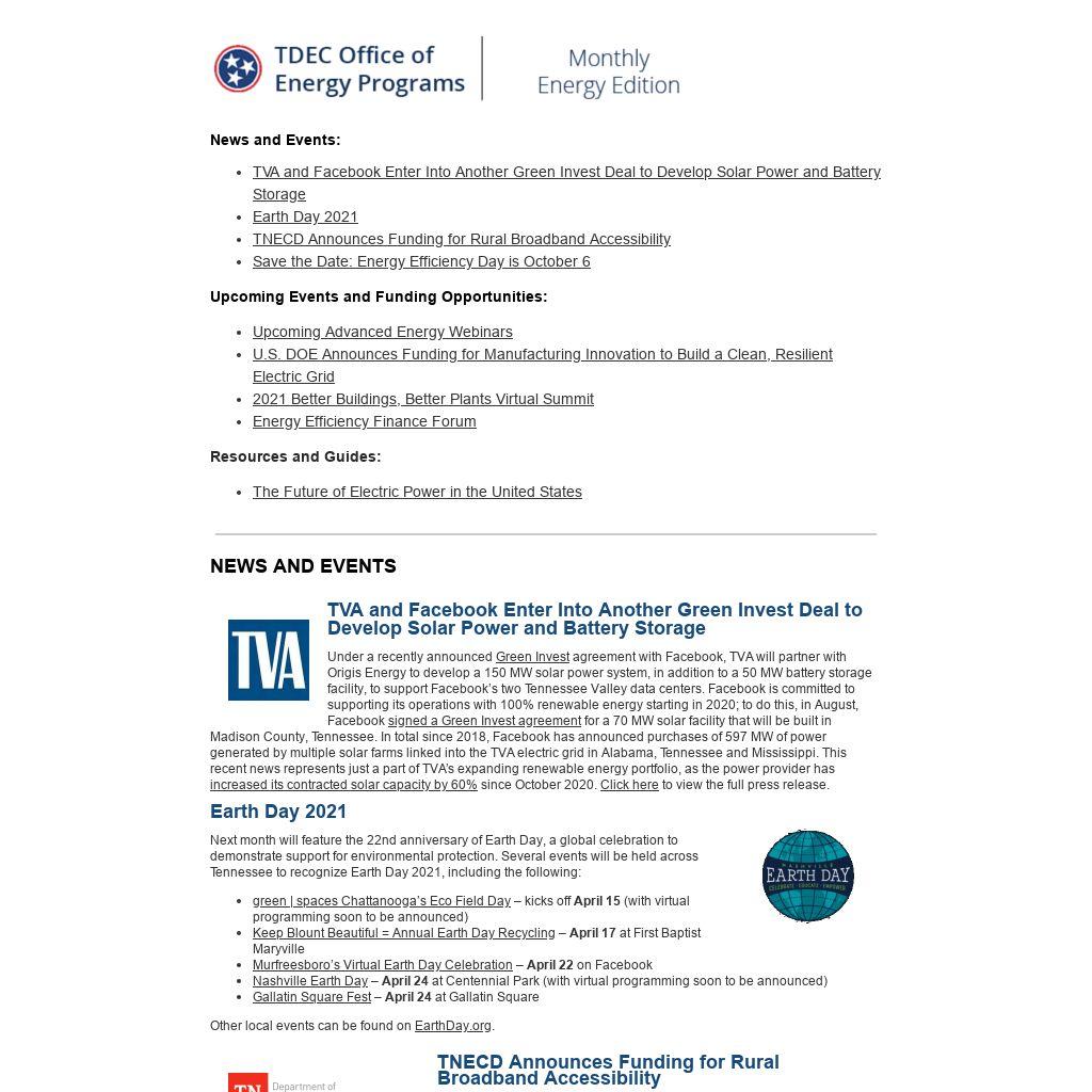 Under a recently announced Green Invest agreement with Facebook, TVA will partner with Origis Energy to develop a 150 MW solar power system, in addition to a 50 MW battery storage facility, to support Facebook’s two Tennessee Valley data centers. Facebook is committed to supporting its operations with 100% renewable energy starting in 2020; to do this, in August, Facebook signed a Green Invest agreement for a 70 MW solar facility that will be built in Madison County, Tennessee. In total since 2018, Facebook has announced purchases of 597 MW of power generated by multiple solar farms linked into the TVA electric grid in Alabama, Tennessee and Mississippi. This recent news represents just a part of TVA’s expanding renewable energy portfolio, as the power provider has increased its contracted solar capacity by 60% since October 2020. Click here to view the full press release.