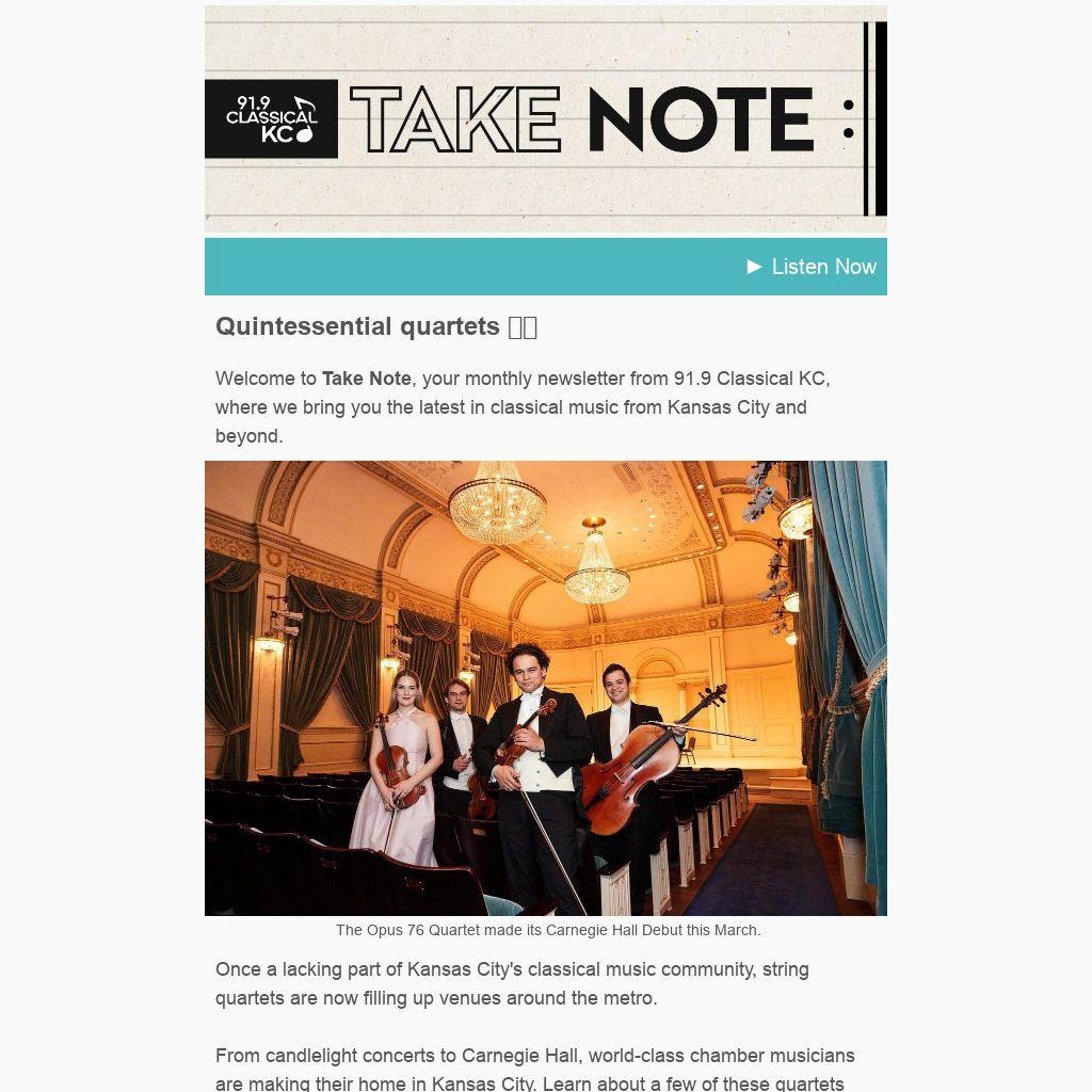 Welcome to Take Note, your monthly newsletter from 91.9 Classical KC, where we bring you the latest in classical music from Kansas City and beyond.
