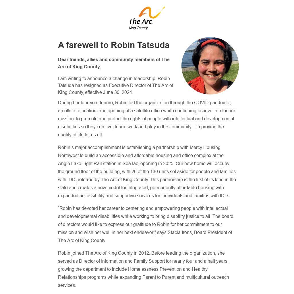 “Robin has devoted her career to centering and empowering people with intellectual and developmental disabilities while working to bring disability justice to all. The board of directors would like to express our gratitude to Robin for her commitment to our mission and wish her well in her next endeavor,” says Stacia Irons, Board President of The Arc of King County.