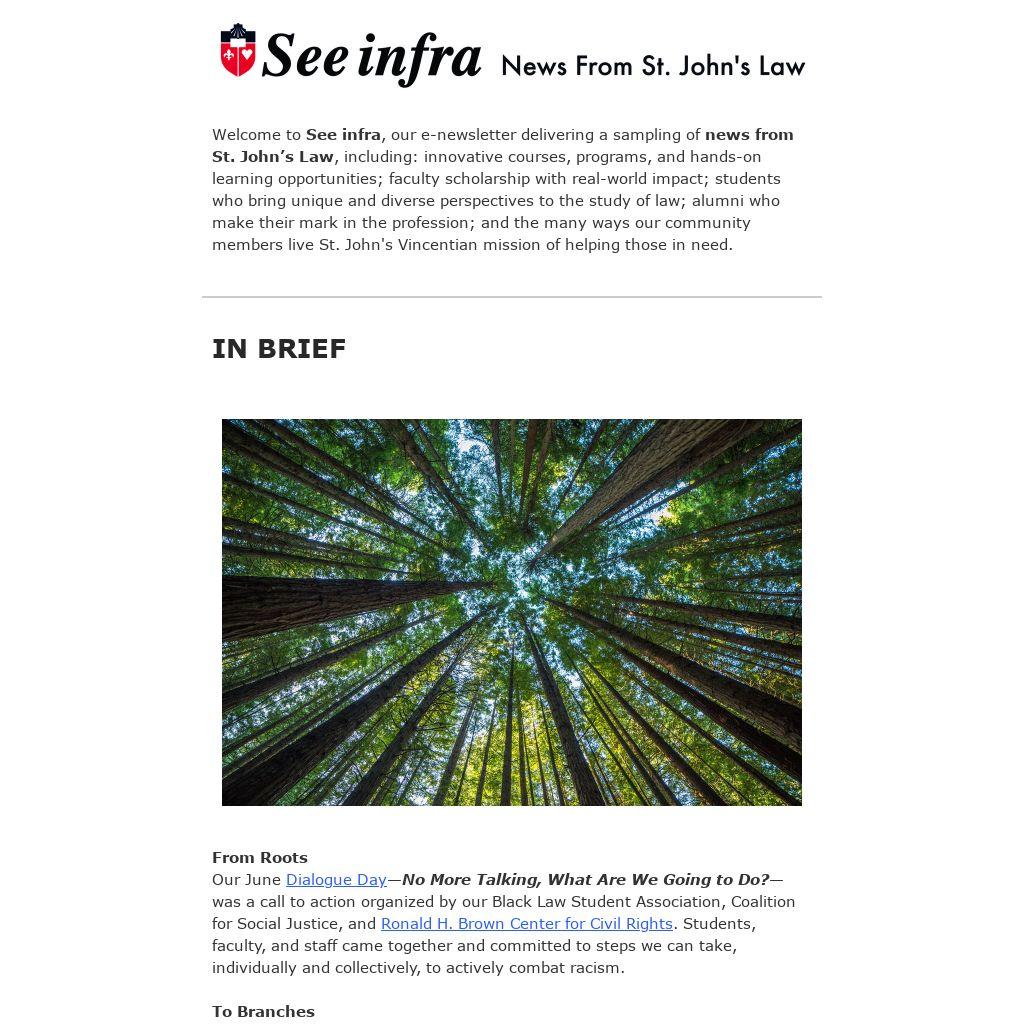 | Welcome to See infra, our e-newsletter delivering a sampling of news from St. John’s Law, including: innovative courses, programs, and hands-on learning opportunities; faculty scholarship with real-world impact; students who bring unique and diverse perspectives to the study of law; alumni who make their mark in the profession; and the many ways our community members live St. John's Vincentian mission of helping those in need.