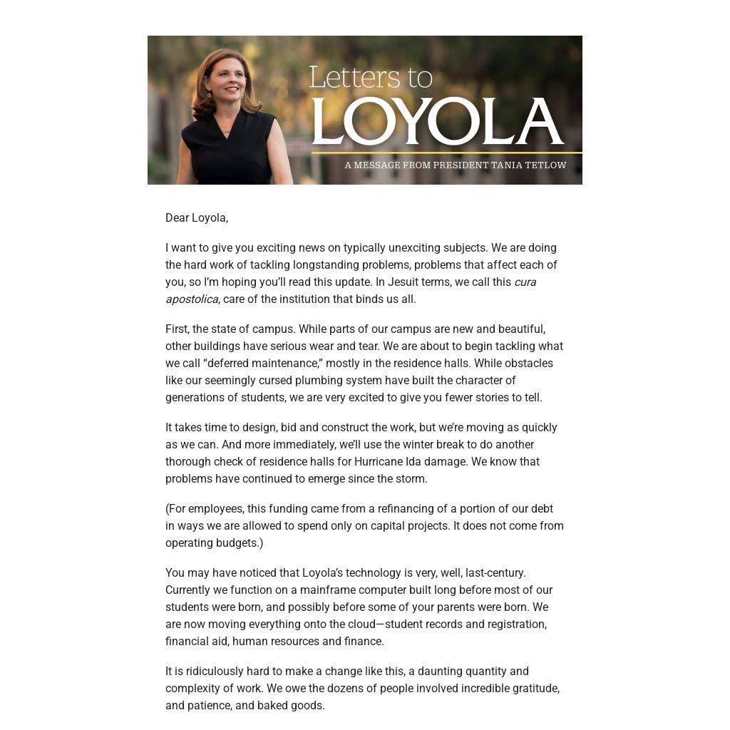 I want to give you exciting news on typically unexciting subjects. We are doing the hard work of tackling longstanding problems, problems that affect each of you, so I’m hoping you’ll read this update. In Jesuit terms, we call this cura apostolica, care of the institution that binds us all.