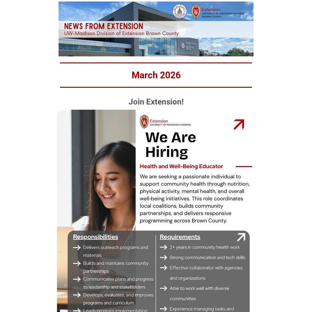 The University of Wisconsin–Madison Division of Extension is seeking a Health and Well-Being Educator (Part-Time) to support community-driven health initiatives in Brown County.