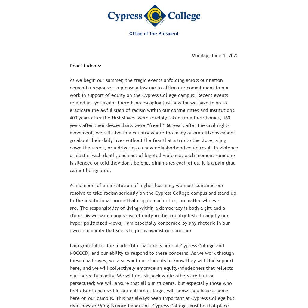 As we begin our summer, the tragic events unfolding across our nation demand a response, so please allow me to affirm our commitment to our work in support of equity on the Cypress College campus. Recent events remind us, yet again, there is no escaping just how far we have to go to eradicate the awful stain of racism within our communities and institutions. 400 years after the first slaves were forcibly taken from their homes, 160 years after their descendants were “freed,” 60 years after the civil rights movement, we still live in a country where too many of our citizens cannot go about their daily lives without the fear that a trip to the store, a jog down the street, or a drive into a new neighborhood could result in violence or death. Each death, each act of bigoted violence, each moment someone is silenced or told they don't belong, diminishes each of us. It is a pain that cannot be ignored.