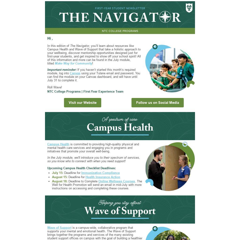 In this edition of The Navigator, you’ll learn about resources like Campus Health and Wave of Support that take a holistic approach to your wellbeing, discover mentorship opportunities designed just for first-year students, and get inspired to show off your school spirit! All of this information and more can be found in the July module, titled Make Way for Community!