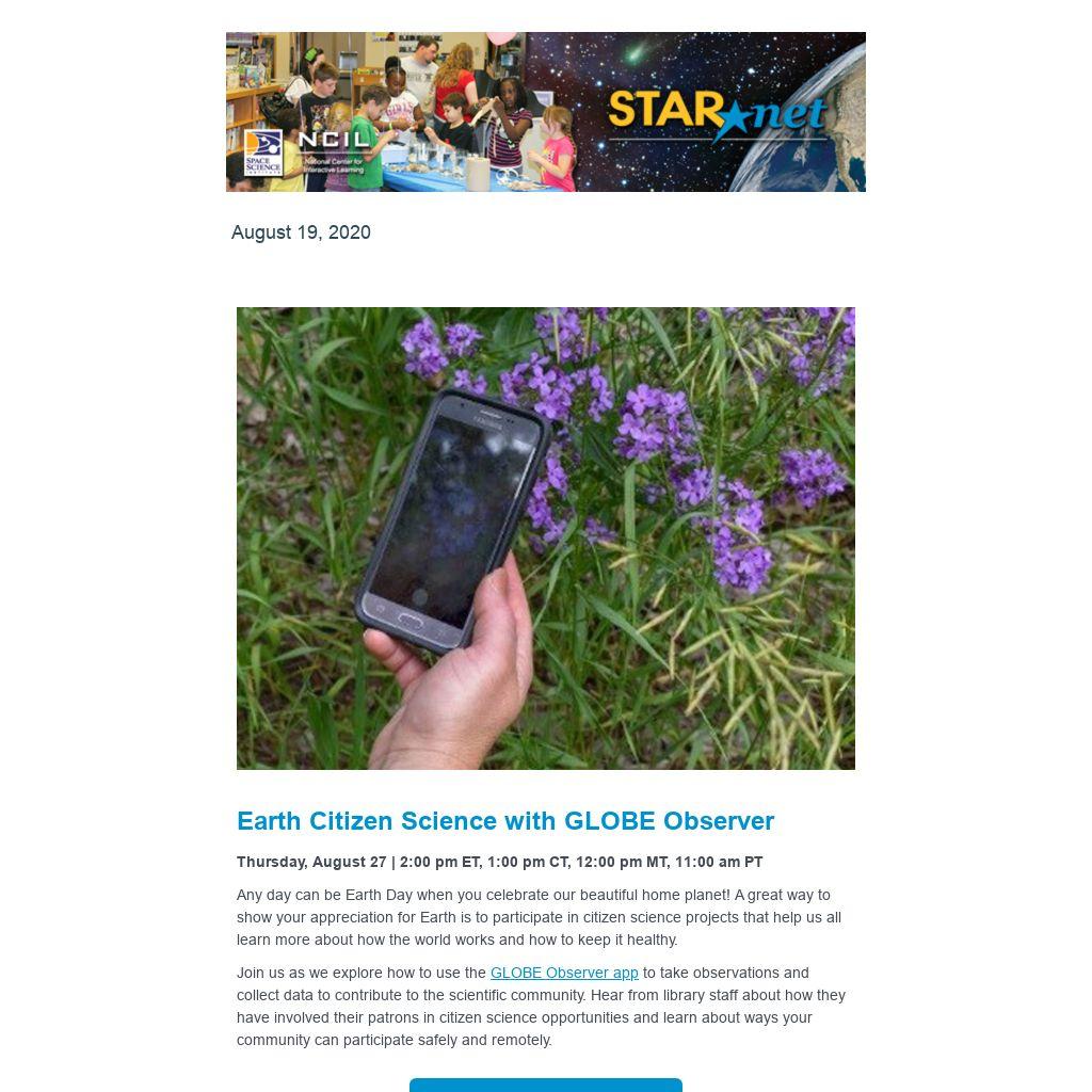 Join us as we explore how to use the GLOBE Observer app to take observations and collect data to contribute to the scientific community. Hear from library staff about how they have involved their patrons in citizen science opportunities and learn about ways your community can participate safely and remotely.
