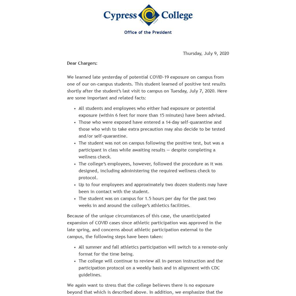 We again want to stress that the college believes there is no exposure beyond that which is described above. In addition, we emphasize that the college’s employees followed the procedures and protocols related to allowing students on campus.