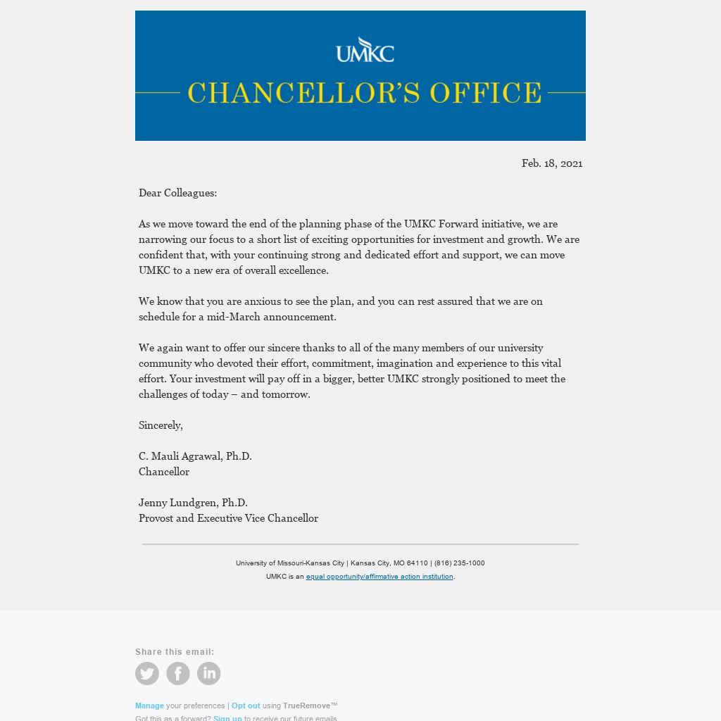 As we move toward the end of the planning phase of the UMKC Forward initiative, we are narrowing our focus to a short list of exciting opportunities for investment and growth. We are confident that, with your continuing strong and dedicated effort and support, we can move UMKC to a new era of overall excellence.