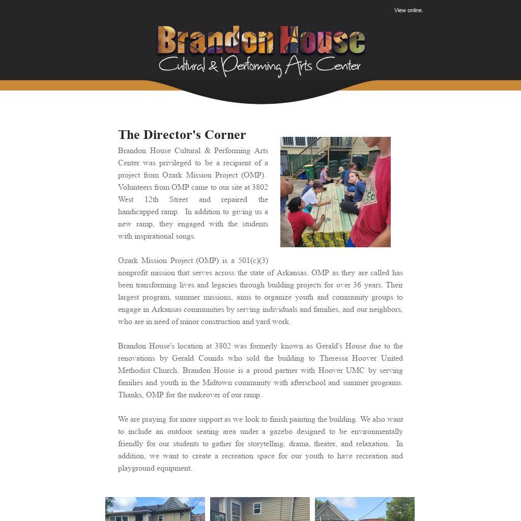 Brandon House Cultural & Performing Arts Center was privileged to be a recipient of a project from Ozark Mission Project (OMP). Volunteers from OMP came to our site at 3802 West 12th Street and repaired the handicapped ramp. In addition to giving us a new ramp, they engaged with the students with inspirational songs.