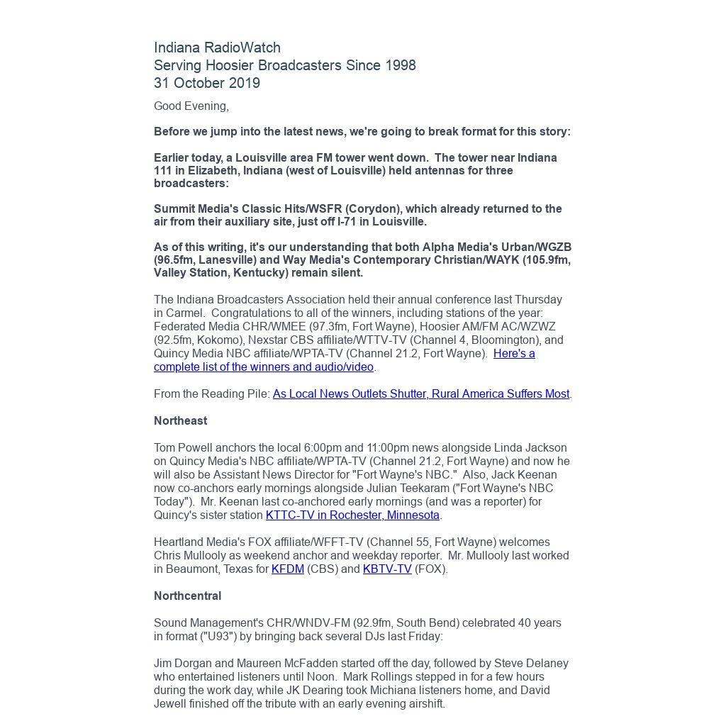 Indiana RadioWatch subscriptions are free. To subscribe, send an e-mail to irw@well.com and we'll add you. After publication, we archive Indiana RadioWatch on the Indiana Radio Archive at indianaradio.net. Please e-mail us your news stories and employment opportunities.