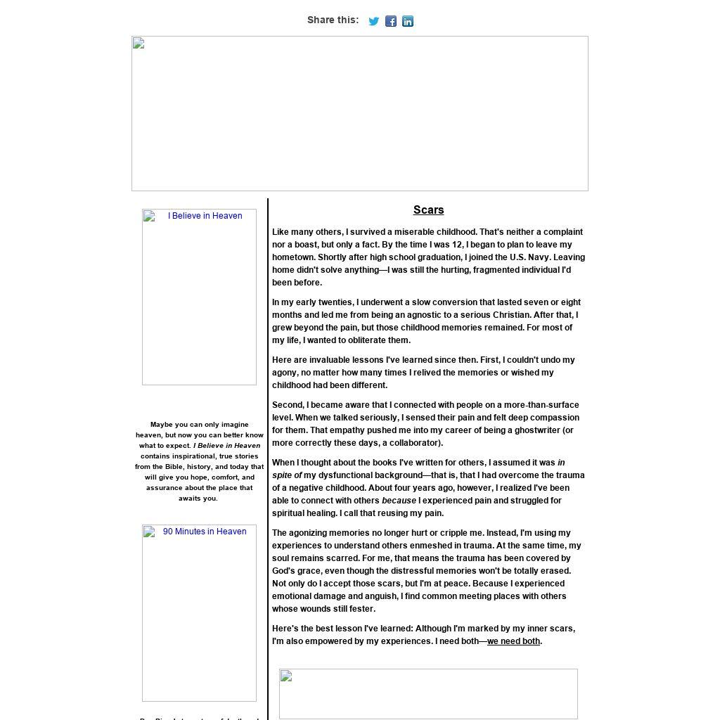 The agonizing memories no longer hurt or cripple me. Instead, I'm using my experiences to understand others enmeshed in trauma. At the same time, my soul remains scarred. For me, that means the trauma has been covered by God's grace, even though the distressful memories won't be totally erased. Not only do I accept those scars, but I'm at peace. Because I experienced emotional damage and anguish, I find common meeting places with others whose wounds still fester.