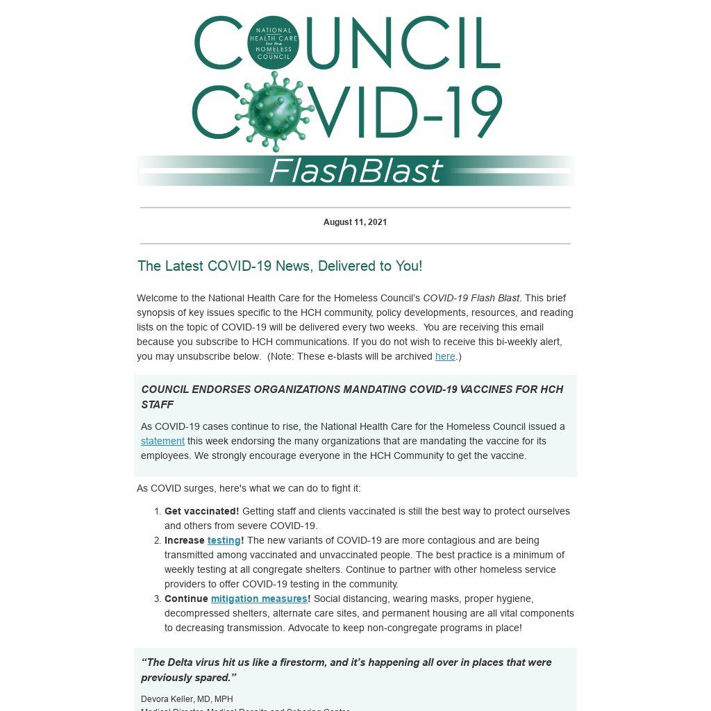 Welcome to the National Health Care for the Homeless Council’s COVID-19 Flash Blast. This brief synopsis of key issues specific to the HCH community, policy developments, resources, and reading lists on the topic of COVID-19 will be delivered every two weeks. You are receiving this email because you subscribe to HCH communications. If you do not wish to receive this bi-weekly alert, you may unsubscribe below. (Note: These e-blasts will be archived here.)