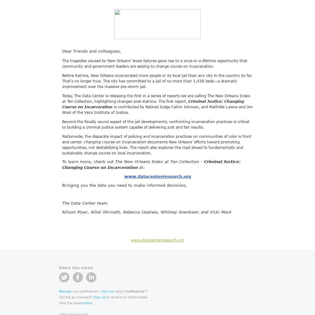 Today, The Data Center is releasing the first in a series of reports we are calling The New Orleans Index at Ten Collection, highlighting changes post-Katrina. The first report, Criminal Justice: Changing Course on Incarceration is contributed by Retired Judge Calvin Johnson, and Mathilde Laisne and Jon Wool of the Vera Institute of Justice.