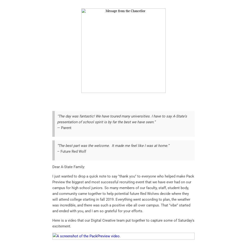 I just wanted to drop a quick note to say "thank you" to everyone who helped make Pack Preview the biggest and most successful recruiting event that we have ever had on our campus for high school juniors. So many members of our faculty, staff, student body, and community came together to help potential future Red Wolves decide where they will attend college starting in fall 2019. Everything went according to plan, the weather was incredible, and there was such a positive vibe all over campus. That "vibe" started and ended with you, and I am so grateful for your efforts.