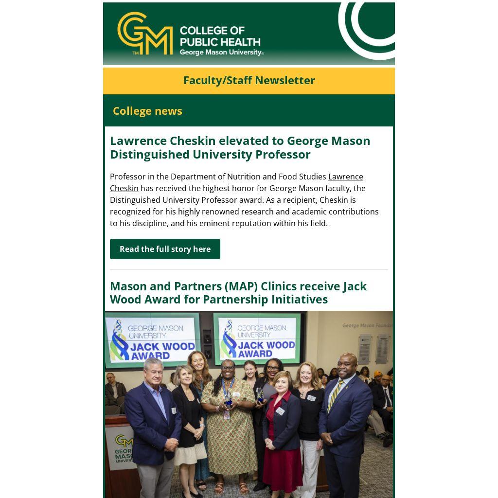 Professor in the Department of Nutrition and Food Studies Lawrence Cheskin has received the highest honor for George Mason faculty, the Distinguished University Professor award. As a recipient, Cheskin is recognized for his highly renowned research and academic contributions to his discipline, and his eminent reputation within his field.