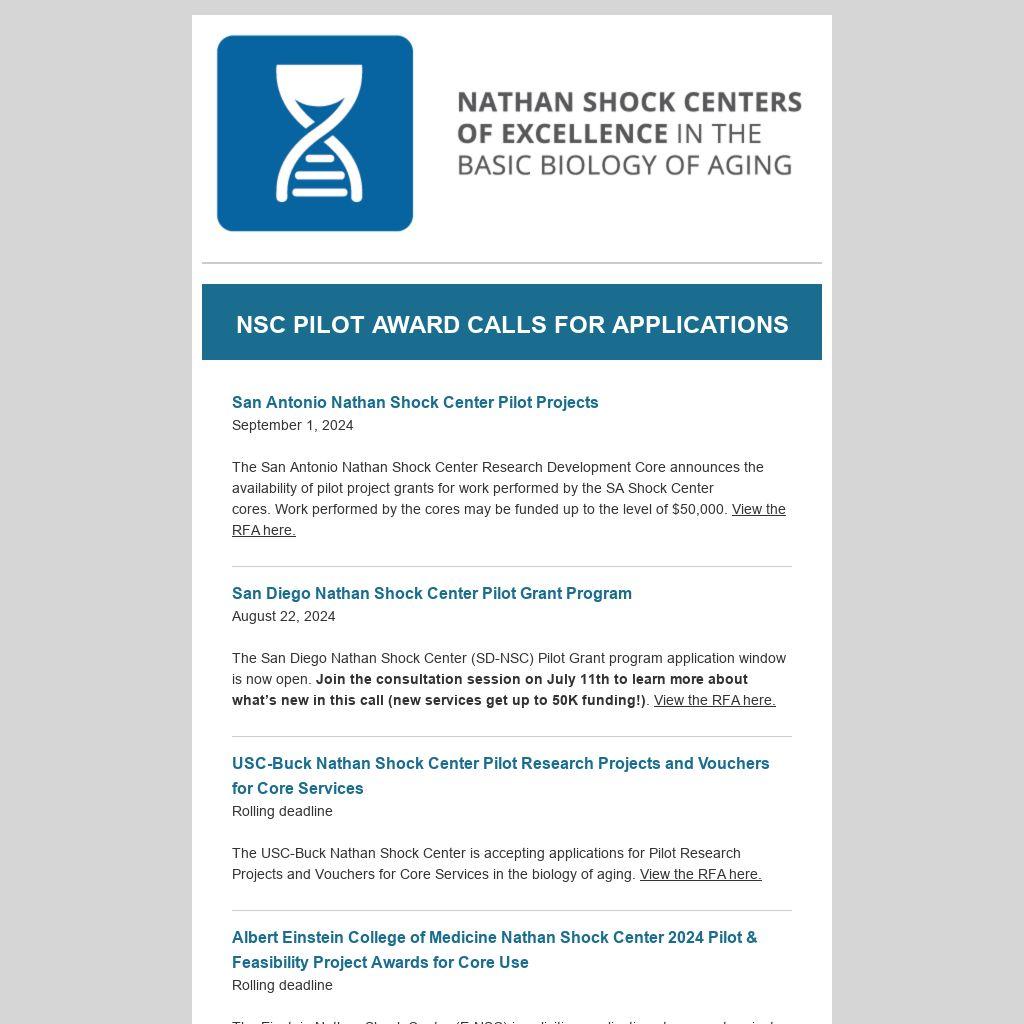 The San Diego Nathan Shock Center (SD-NSC) Pilot Grant program application window is now open. Join the consultation session on July 11th to learn more about what’s new in this call (new services get up to 50K funding!). View the RFA here.