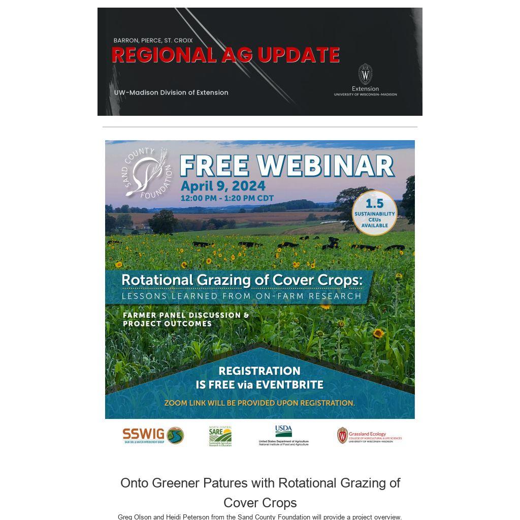 This webinar is of interest to farmers, crop advisors, agronomists, and more. A wide range of topics will be addressed throughout the season, as Extension educators and specialists inform programming with what they’re seeing on real Wisconsin farms and within research. The series provides relevant crop and soil updates, agronomic considerations related to weather and climate, research-backed resources, and more to ensure farmers are as up-to-date as possible about the multitude of factors affecting their crop season.