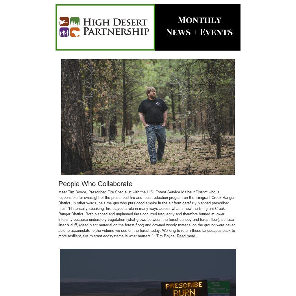 Upcoming Events Tuesday, May 7 | Harney County Restoration Collaborative Meeting Saturday, May 11 | Fire Wise Event Wednesday, May 15 | High Desert Partnership Board Meeting Thursday, May 23 | Harney County Wildfire Collaborative Meeting Wednesday, June 12 | Harney County Restoration Collaborative Meeting Wednesday, June 19 | High Desert Partnership Board Meeting Thursday, June 20 | Harney Basin Wetlands Initiative Collaborative Meeting