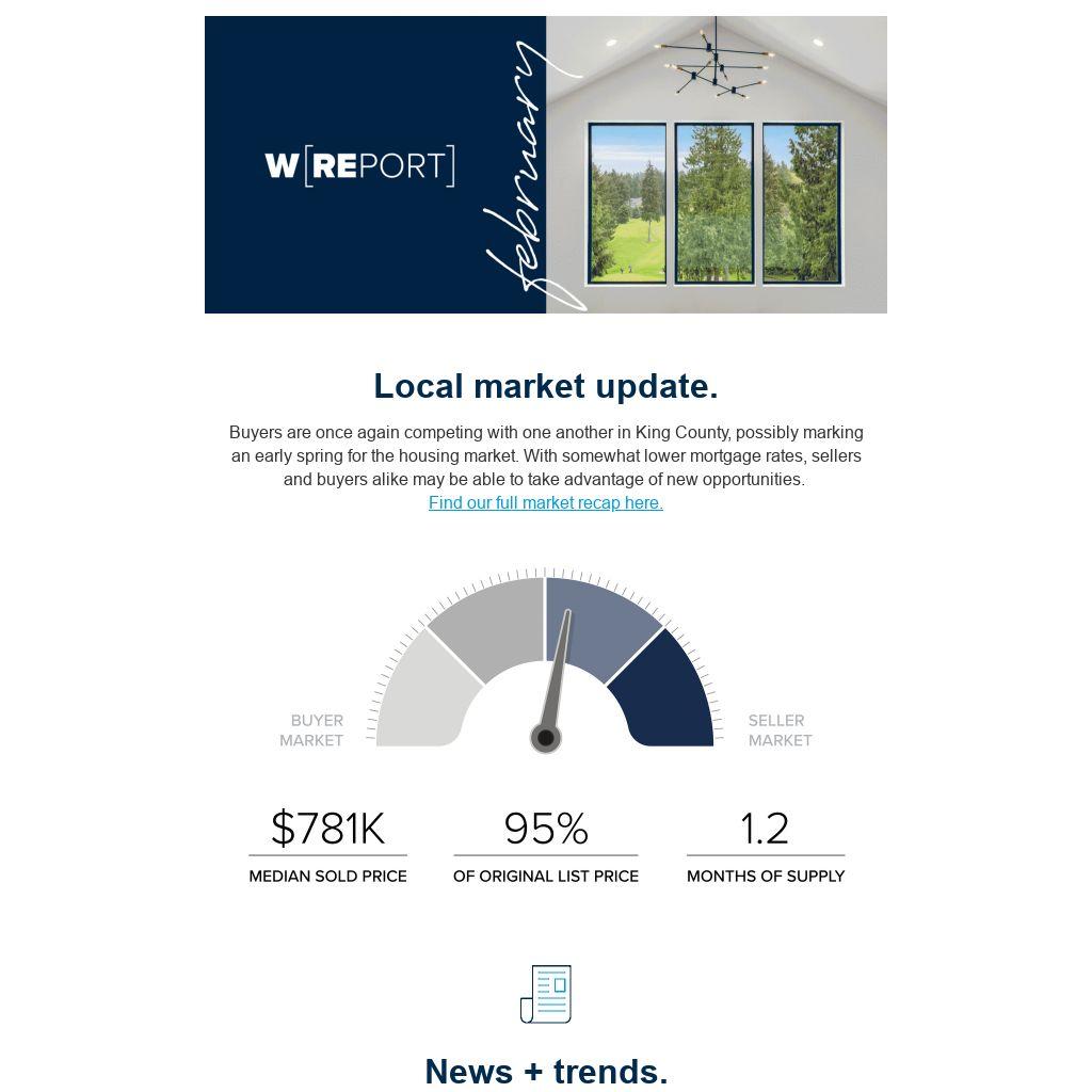 Buyers are once again competing with one another in King County, possibly marking an early spring for the housing market. With somewhat lower mortgage rates, sellers and buyers alike may be able to take advantage of new opportunities. Find our full market recap here.