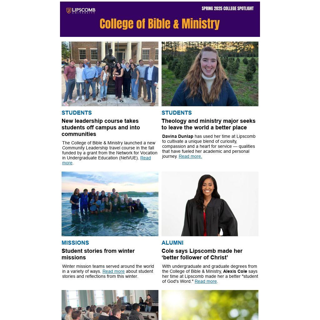 In January the College of Bible & Ministry hosted a community lunch, game night and a Pastoral Leadership Retreat. Highlights of other activities this semester: