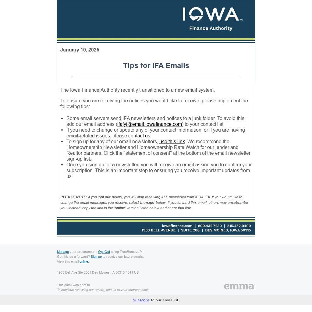 Some email servers send IFA newsletters and notices to a junk folder. To avoid this, add our email address (ifafyi@email.iowafinance.com) to your contact list.