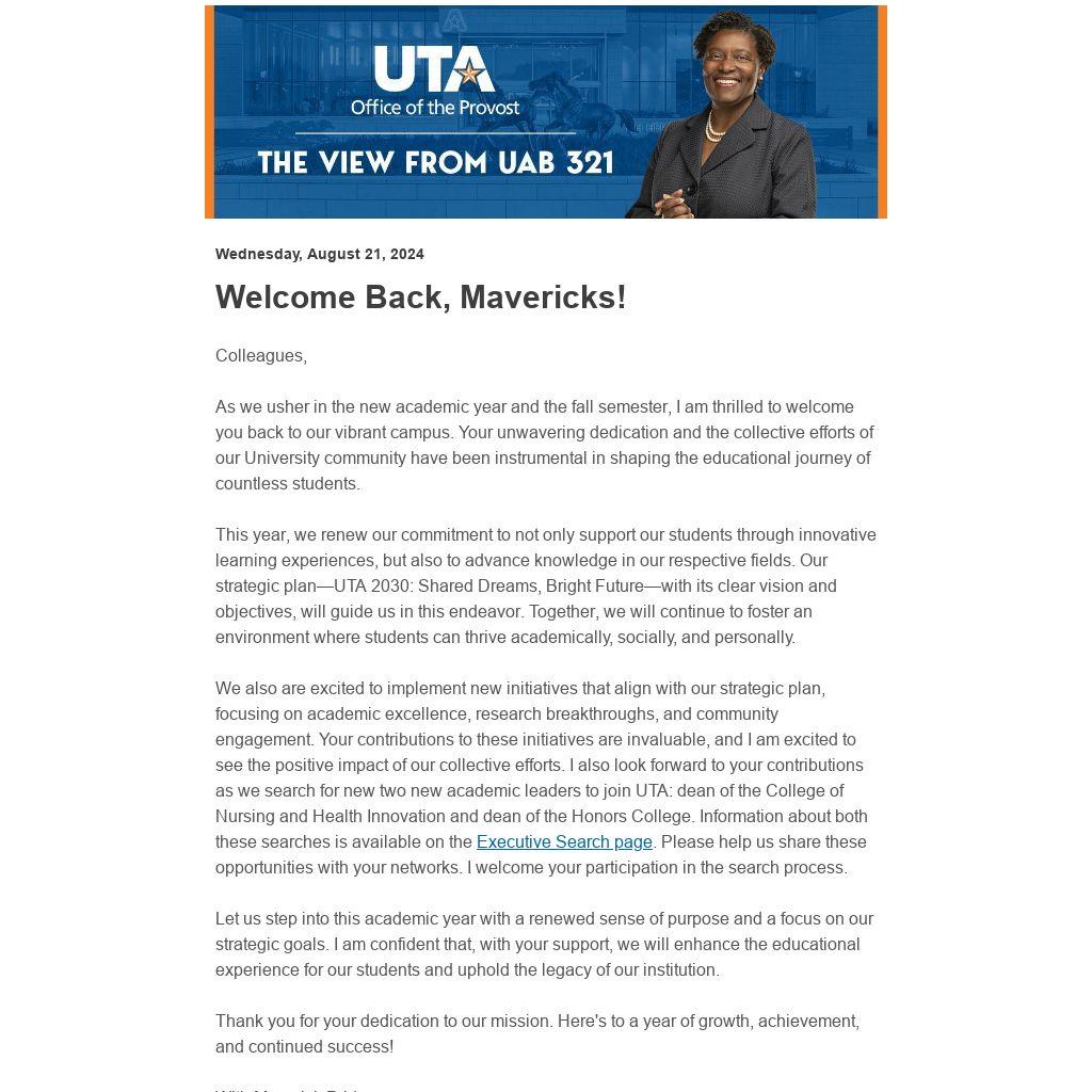 We also are excited to implement new initiatives that align with our strategic plan, focusing on academic excellence, research breakthroughs, and community engagement. Your contributions to these initiatives are invaluable, and I am excited to see the positive impact of our collective efforts. I also look forward to your contributions as we search for new two new academic leaders to join UTA: dean of the College of Nursing and Health Innovation and dean of the Honors College. Information about both these searches is available on the Executive Search page. Please help us share these opportunities with your networks. I welcome your participation in the search process.