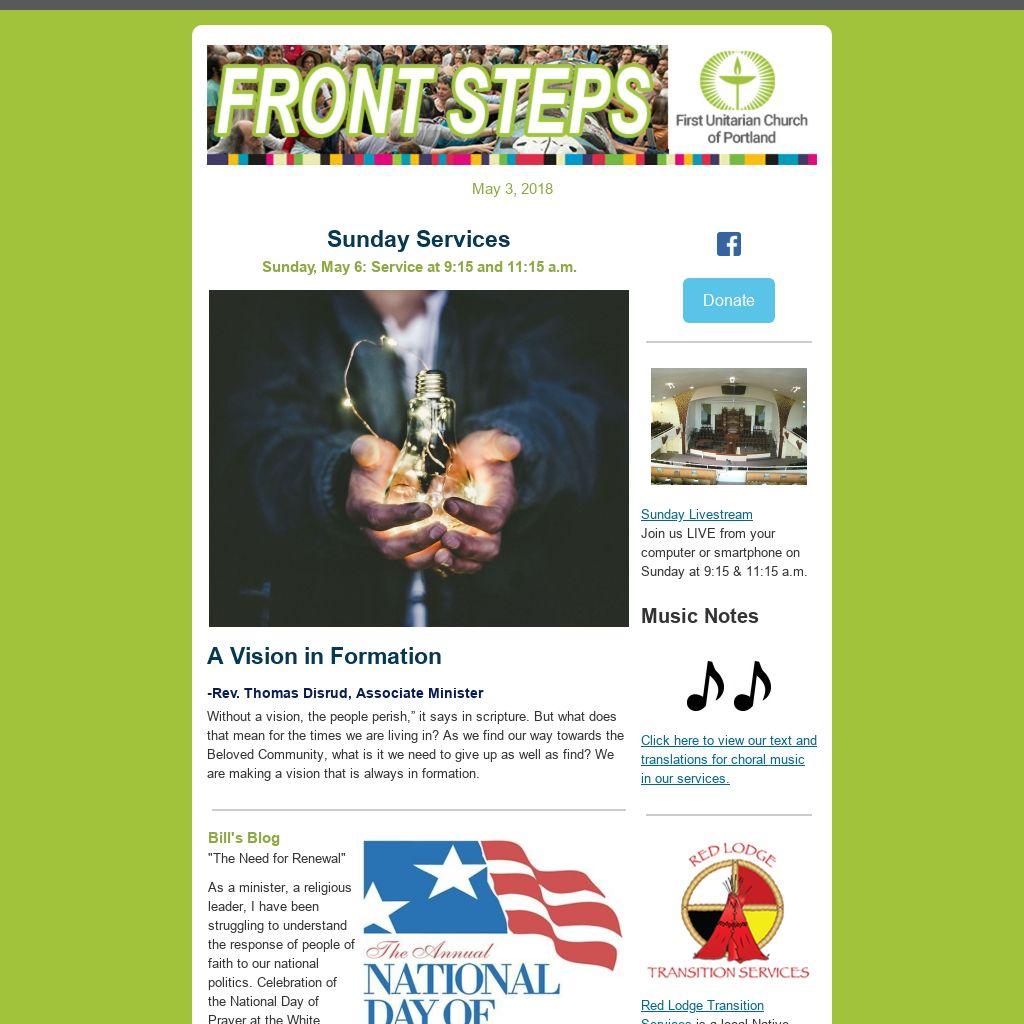 Do You Have an Item for E-news or the Sunday Bulletin?If you have an item you’d like published in our weekly Front Steps (eNews) or the Sunday Bulletin, please submit it to: