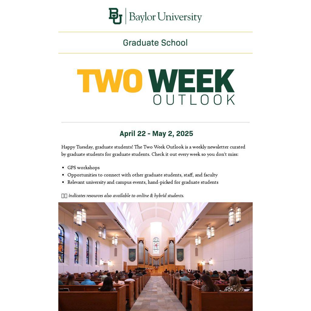 Happy Tuesday, graduate students! The Two Week Outlook is a weekly newsletter curated by graduate students for graduate students. Check it out every week so you don't miss:
