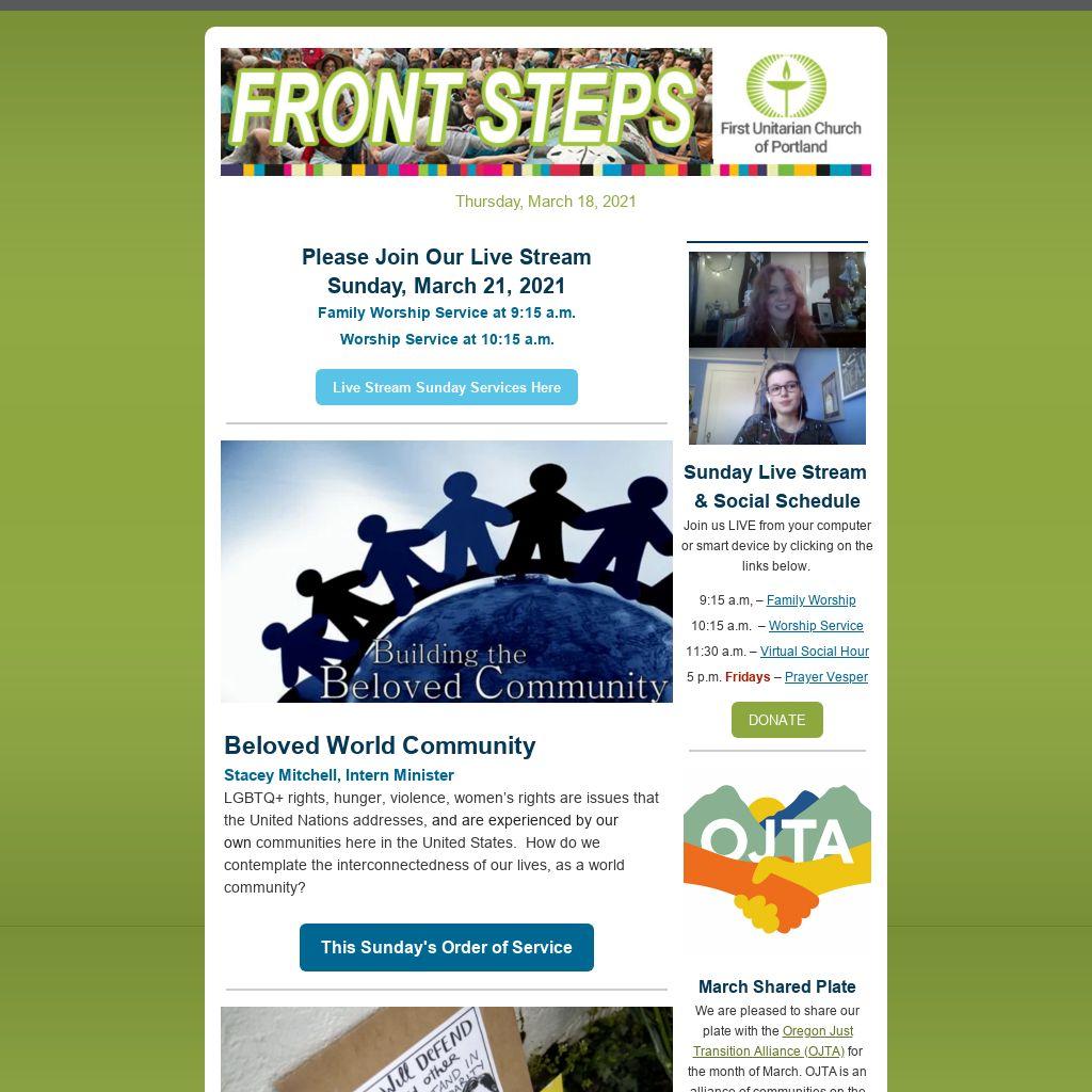 Church Communications: Do you receive messages from the church including this weekly E-News and our Staying Connected emails? To receive church emails send a note to etafuri@firstunitarianportland.org.