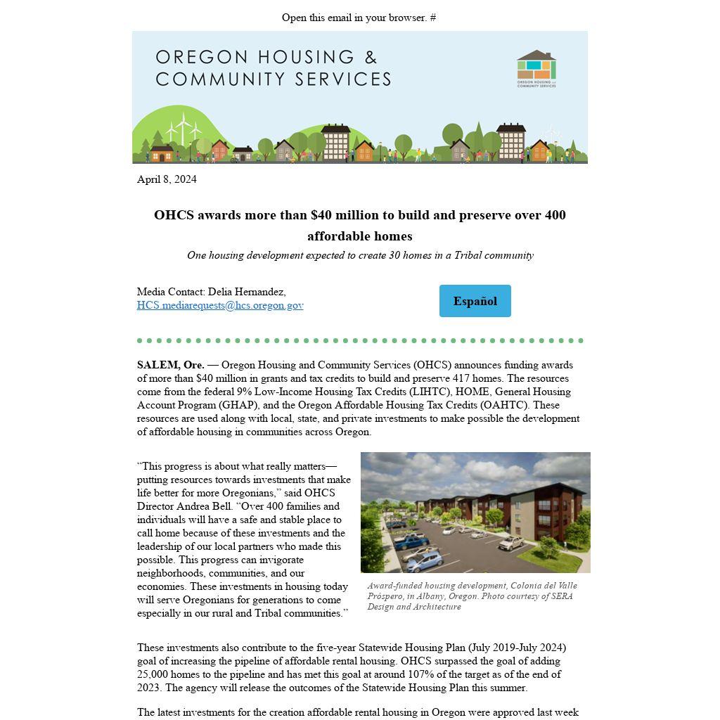 SALEM, Ore. — Oregon Housing and Community Services (OHCS) announces funding awards of more than $40 million in grants and tax credits to build and preserve 417 homes. The resources come from the federal 9% Low-Income Housing Tax Credits (LIHTC), HOME, General Housing Account Program (GHAP), and the Oregon Affordable Housing Tax Credits (OAHTC). These resources are used along with local, state, and private investments to make possible the development of affordable housing in communities across Oregon.