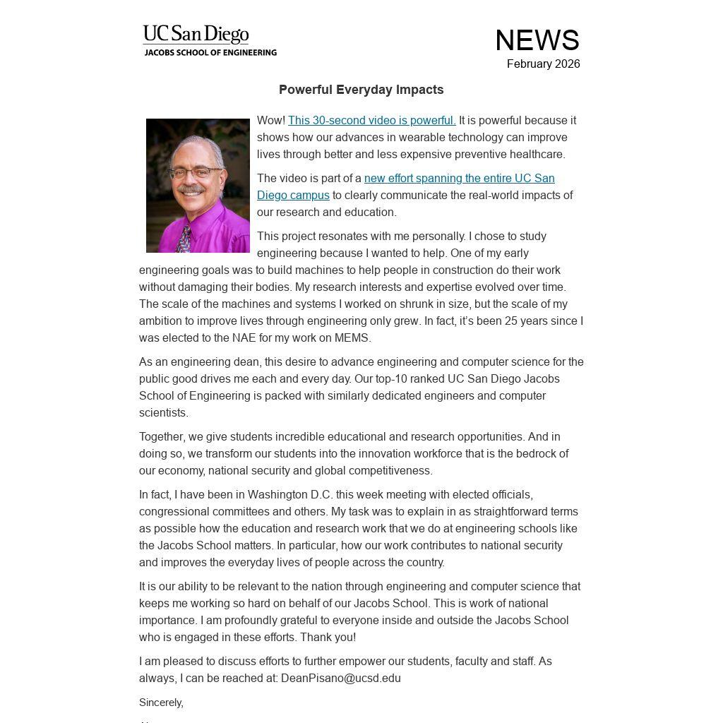 It is our ability to be relevant to the nation through engineering and computer science that keeps me working so hard on behalf of our Jacobs School. This is work of national importance. I am profoundly grateful to everyone inside and outside the Jacobs School who is engaged in these efforts. Thank you!