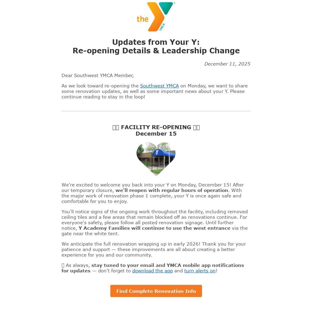 π As always, stay tuned to your email and YMCA mobile app notifications for updates β don't forget to download the appΒ andΒ turn alerts on!
