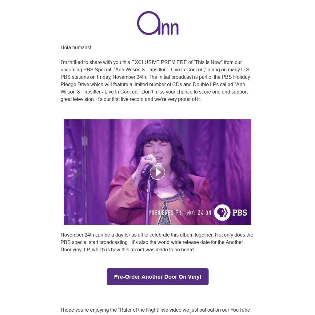 I’m thrilled to share with you this EXCLUSIVE PREMIERE of “This Is Now" from our upcoming PBS Special, “Ann Wilson & Tripsitter – Live In Concert,” airing on many U.S. PBS stations on Friday, November 24th. The initial broadcast is part of the PBS Holiday Pledge Drive which will feature a limited number of CDs and Double LPs called "Ann Wilson & Tripsitter - Live In Concert.” Don’t miss your chance to score one and support great television. It’s our first live record and we’re very proud of it.