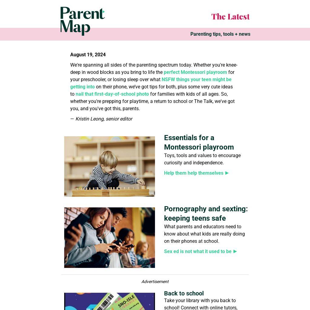 We're spanning all sides of the parenting spectrum today. Whether you're knee-deep in wood blocks as you bring to life the perfect Montessori playroom for your preschooler, or losing sleep over what NSFW things your teen might be getting into on their phone, we’ve got tips for both, plus some very cute ideas to nail that first-day-of-school photo for families with kids of all ages. So, whether you're prepping for playtime, a return to school or The Talk, we've got you, and you've got this, parents.